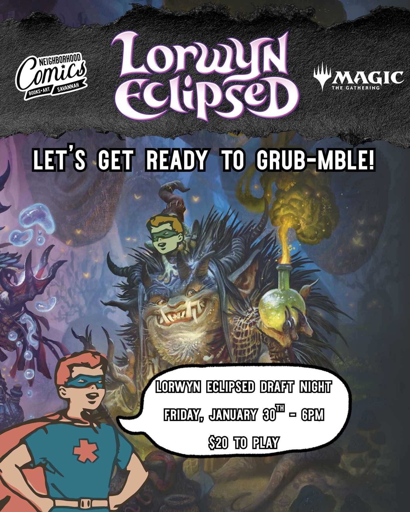 Let's get ready to Grub-Mble! #LorwynEclipsed Draft Night is Friday, January 30th at 6PM at Neighborhood Comics - 1205 Bull St. in #Savannah. $20 to play. See you soon, mages! #magicthegathering